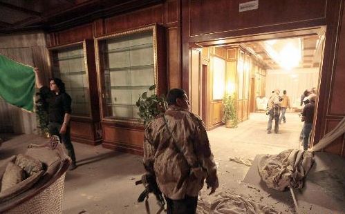 4月25日,在利比亞首都的黎波里,利比亞士兵在被轟炸的利比亞領導人卡扎菲的官邸內查看。北約戰機25日凌晨對利比亞領導人卡扎菲在的黎波里的官邸實施轟炸。