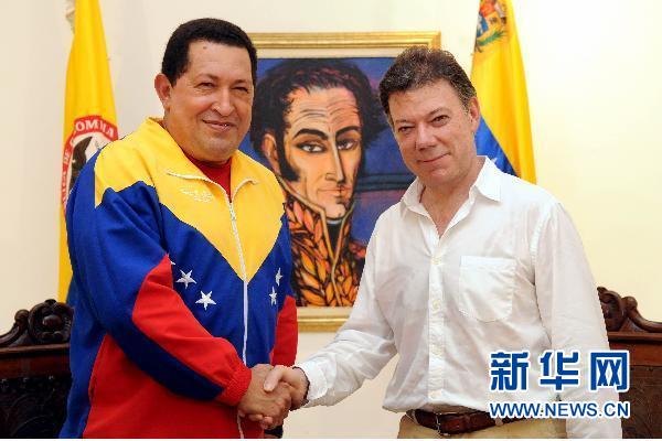 8月10日,哥倫比亞總統桑托斯(右)和委內瑞拉總統查韋斯在哥倫比亞圣瑪爾塔市舉行會談。哥倫比亞總統桑托斯當日在與委內瑞拉總統查韋斯會談后宣布兩國恢復外交關系。此前,由于哥倫比亞前總統阿爾瓦羅·烏里韋的政府指責委內瑞拉在其領土上庇護哥反政府武裝,委總統查韋斯于7月22日宣布與哥倫比亞斷交。