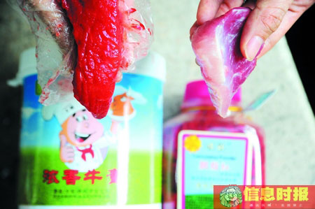 到底傳聞中的“牛肉膏”會有怎樣神奇的效果呢?記者決定親自做個實驗。按照店主所說,記者首先買來新鮮的豬肉,將其一分為二。將其中一塊豬肉先用牛肉醬腌制了3分鐘,短短幾分鐘,肉的表面已經呈現出與牛肉近似的顏色,聞起來也是十足的牛肉味。然后再調制適量的胭脂紅色素,加入已經腌制好了的豬肉,豬肉馬上實現了“華麗”變色。
