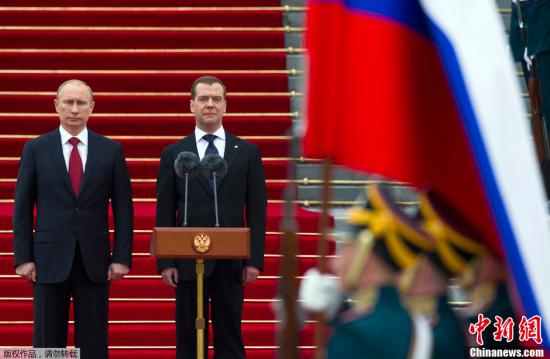 5月7日,俄羅斯新任總統(tǒng)普京在宣誓就職后,與卸任總統(tǒng)梅德韋杰夫共同檢閱克里姆林宮的警衛(wèi)團。