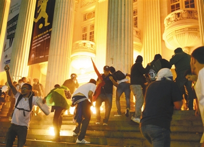 當地時間17日晚,里約熱內盧,抗議者沖上政府部門大樓臺階。巴西全國多個大城市當天爆發20年來最大示威。