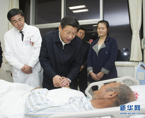 兩天來,習近平一直關注著事故搶險工作,惦記著在事故中受到損失的群眾。24日下午,習近平一抵達青島,就在山東省委書記姜異康、省長郭樹清陪同下,來到青島大學附屬醫院黃島分院,看望慰問傷員、醫護人員和遇難者家屬。他走進病房,先后來到受傷群眾姜瑞芬、薛淑美、徐之泰、孫桂山病床前,同他們親切握手,仔細查看傷情,鼓勵他們配合治療、安心養病。習近平同醫療專家代表一一握手,肯定他們關鍵時刻迅速行動、連續作戰、不怕疲勞的救死扶傷精神,希望他們勞逸結合、科學調度、再接再厲,確保每個傷員都得到精心治療。習近平在看望遇難者家屬時,對他們親屬的不幸遇難表示哀悼,希望他們節哀制痛、樹立生活信心,表示黨和政府一定會盡最大努力安排好大家工作生活。他要求有關部門要一家一家把善后工作做細做實。
