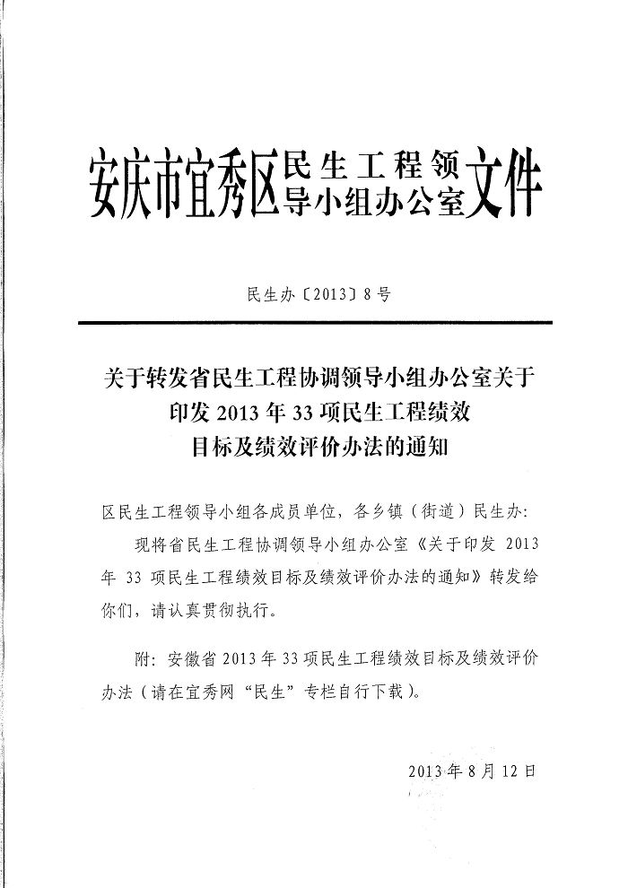 關于轉發安徽省2013年33項民生工程績效目標及績效評價辦法的通知