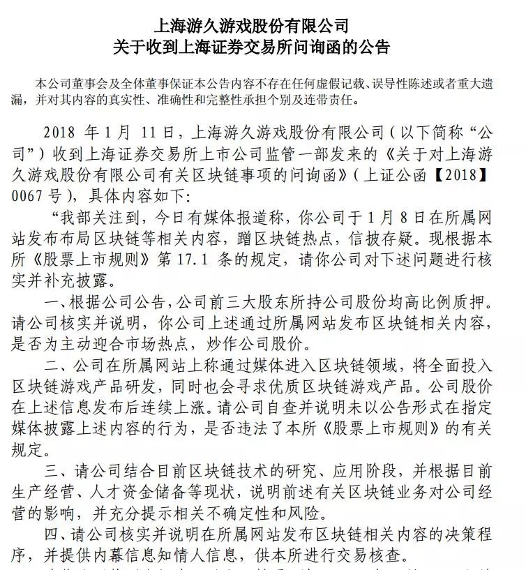 1月11日,上交所向游久游戲下發(fā)有關區(qū)塊鏈事項的問詢函稱,上交所表示,根據公司公告,公司前三大股東所持公司股份均高比例質押。請公司核實并說明,你公司上述通過所屬網站發(fā)布區(qū)塊鏈相關內容,是否為主動迎合市場熱點,炒作公司股價。上交所要求公司結合目前區(qū)塊鏈技術的研究、應用階段,并根據目前生產經營、人才資金儲備等現(xiàn)狀,說明前述有關區(qū)塊鏈業(yè)務對公司經營的影響,并充分提示相關不確定性和風險。