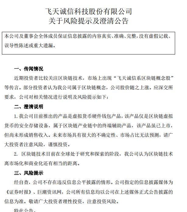 在股價飛漲的時候,飛天誠信還進行說明及風險提示: