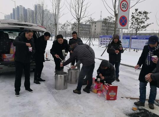 1月28日上午,大橋開發區建設局干部職工在包保的晴嵐路段鏟雪除冰,時至11:40左右,一輛面包車在勞動現場緩緩停下,從車上卸下姜茶和香飄飄奶茶慰問鏟雪人員工。原來,他們是附近企業員工,連續三天看到大橋開發區干部職工頂風冒雪,義務在這條路上鏟雪除冰,十分感動,主動送來熱茶熱飲慰問。(江義學 王玉清)