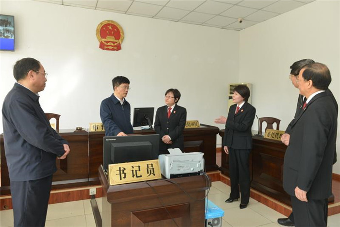 董開軍一行實地察看了宜秀區法院楊橋人民法庭,親切慰問了法庭干警,詳細了解法庭建設和業務工作開展及法庭人員配備、法庭簡易程序適用、陪審率、案件類型分布等情況,并對楊橋法庭的信息化建設、審判運行情況、調解判決家事糾紛案件進行積極探索予以肯定。