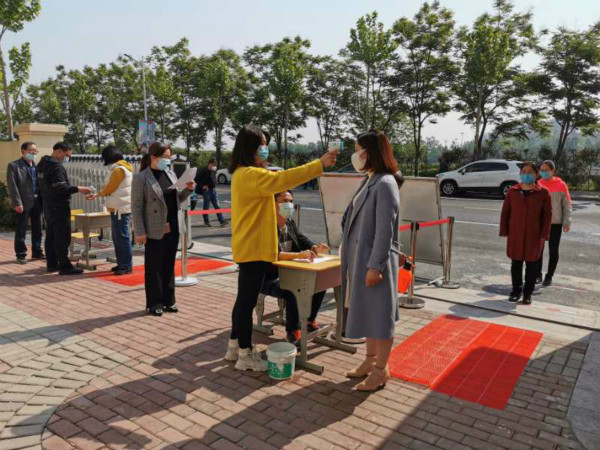 上午9:30,演練正式開(kāi)始。校園門口設(shè)置專門入校通道,每個(gè)“學(xué)生”佩戴口罩,間隔1米、有序排隊(duì)。每個(gè)通道由值班教師維持秩序,指導(dǎo)“學(xué)生”經(jīng)過(guò)消毒地毯,通過(guò)測(cè)溫儀進(jìn)行體溫檢測(cè),檢測(cè)無(wú)異常后由分流通道自不同區(qū)域進(jìn)入教室。