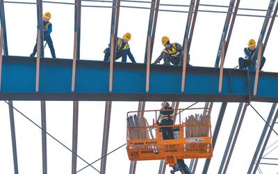江蘇宿遷市經(jīng)濟(jì)開發(fā)區(qū)龍恒新能源產(chǎn)業(yè)園二期項目建設(shè)現(xiàn)場,工人們正在鋼架上忙碌。