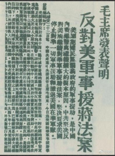 毛澤東以中共中央主席名義發表《反對美國對蔣軍事援助法案的聲明》。聲明指出:美國國務院于本月十四日提付國會審議的繼續對華軍事援助法案,對中國的和平安定與獨立民主有極為不利的影響,因此中國共產黨堅決反對此項法案。中共此種意見,并為中國廣大民主人士所支持。在抗日戰爭中,美國對于中國實施軍事援助,并派遣美軍在中國領土上協同作戰,其目的是擊敗中美的共同敵人日本帝國主義,但就在那時,由于美國錯誤地僅僅援助國民黨軍閥,這種援助也并未有效地加強中國的抵抗,相反地是被國民黨軍閥用以加強其對于積極抗日的中國共產黨與中國解放區的進攻與封鎖。在日本投降以后,美國沒有停止反而極大地加強了對于中國國民黨政府的各種軍事援助,并在此實際目的下派遣龐大的軍隊駐在中國的領土與領海之上,這種行動已經證明是中國大規模內戰爆發與繼續擴大的根本原因。美國實行所謂軍事援助,實際上只是武裝干涉中國內政,只是以強力支持國民黨獨裁政府繼續陷中國于內戰、分裂、混亂、恐怖和貧困,只是使中國不能實現整軍復員和履行其對于聯合國的義務,只是危害中國國家安全獨立與領土主權完整,只是破壞中美兩大民族的光榮友誼與中美貿易的發展前途。在此種現實情況之下,中國共產黨不得不堅決反對美國政府繼續以出售、交換、租借、贈送或讓渡等方式將軍火交給中國的國民黨獨裁政府,堅決反對美國派遣軍事使團來華,并堅決要求美國立即停止與收回對華的一切所謂軍事援助,和立即撤回在華的美國軍隊。