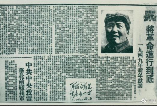 圖為《人民日報》發表的毛澤東撰寫的一九四九年新年獻詞《將革命進行到底》。