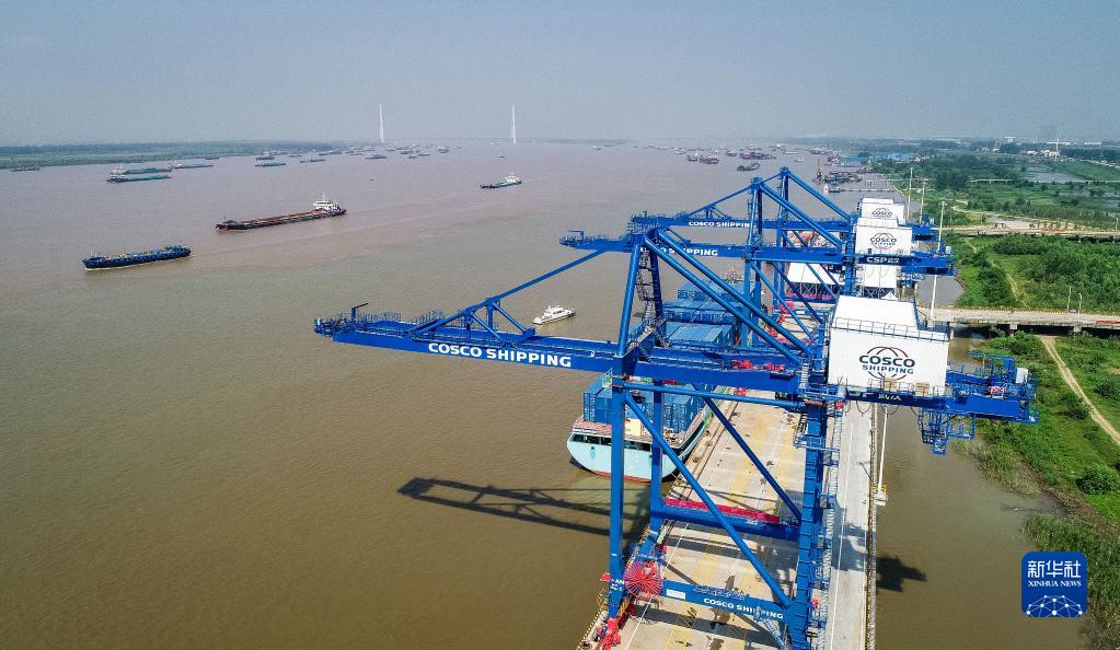 這是8月1日拍攝的陽邏國際港集裝箱水鐵聯運項目碼頭平臺(無人機照片)。新華社發(伍志尊攝)