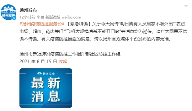 【辟謠】8月15日晚間10時許,揚州市新冠肺炎疫情防控工作指揮部社區防控工作組緊急辟謠,稱“明日所有人員居家不準外出”“農貿市場、超市、藥店關門”“飛機大規模消殺不能開門窗”等消息均為謠傳,請廣大網民不信謠,不傳謠。有關疫情防控措施的消息,請以揚州官方媒體平臺發布的內容為準。