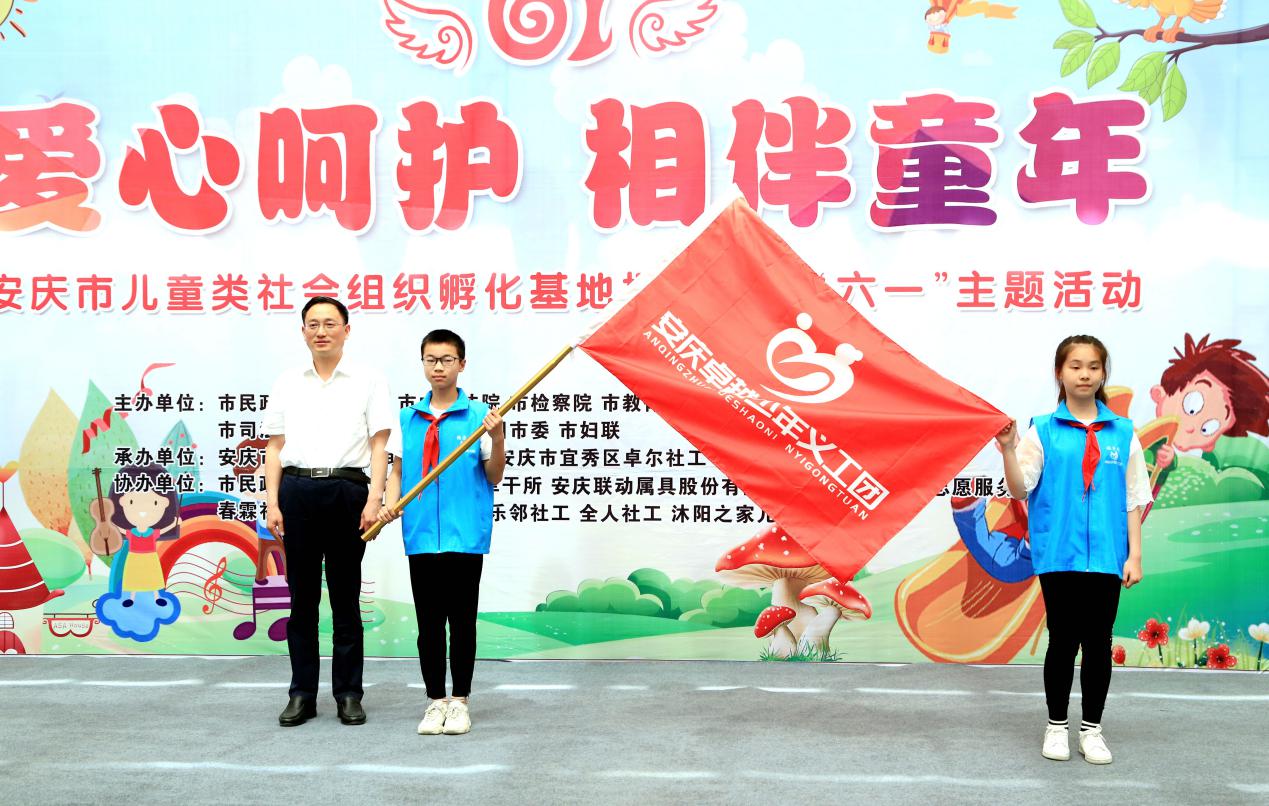 6月1日,由安慶市民政局、市文明辦等11家單位主辦,安慶市未成年人救助保護中心、宜秀區卓爾社工承辦,市志愿服務聯合會、市慈善會等單位協辦的安慶市兒童類社會組織孵化基地揭牌暨“愛心呵護 相伴童年”慶“六一”主題活動在安慶市未成年人救助保護中心成功舉行。安慶市宜秀區卓爾社會工作服務中心等七家機構成功入駐基地。安慶市政府黨組成員、副市長郭家滿親自為入駐機構頒發證書并給由宜秀區卓爾社工組建與運營的卓越少年義工團授旗,與各市直部門負責人共同為安慶市兒童類社會組織孵化基地揭牌。