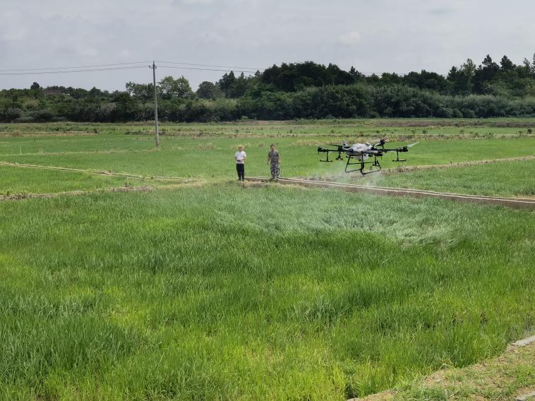 6月23日上午,花元村工作人員正熟練操作植保無人機對高標準農田800畝水稻噴灑除草劑。