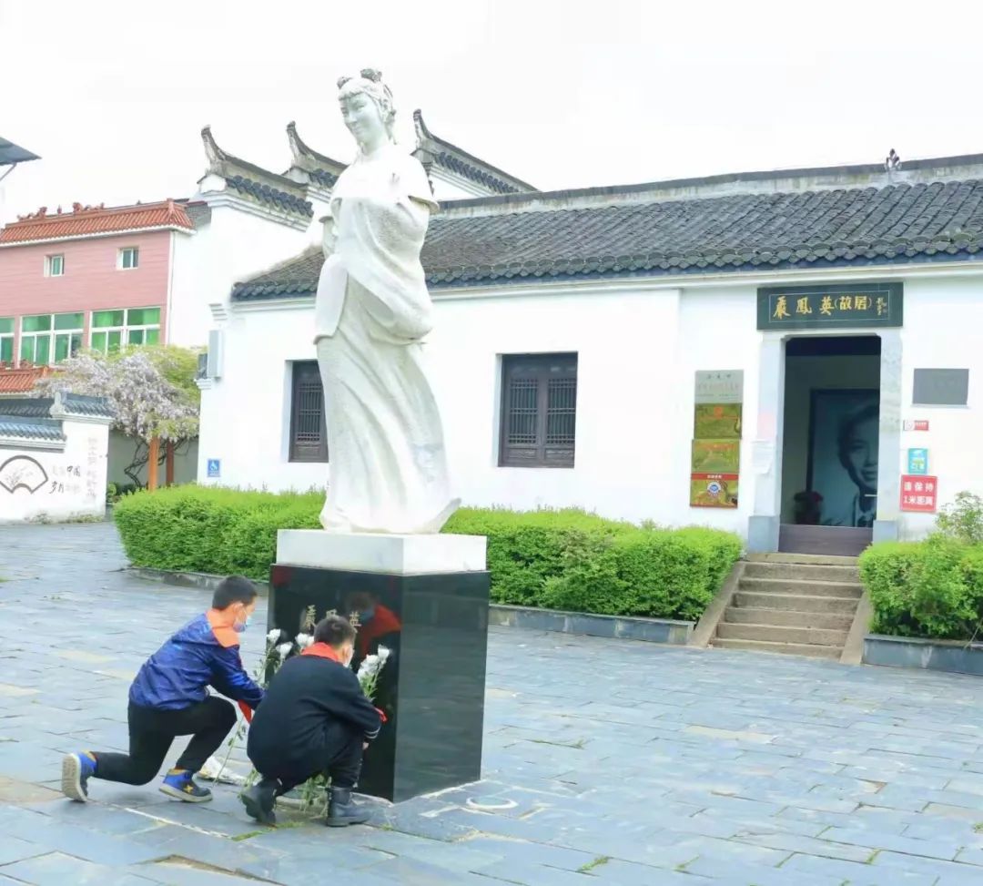 當天上午,黃梅小學學生們和志愿者們來到嚴鳳英故居,開展清明祭祀活動。在嚴鳳英大師雕像前,全體師生整齊列隊、肅立,逐一獻上菊花,寄托哀思。故居講解員嚴老為大家講述大師的生平事跡及對黃梅戲藝術做出的貢獻和突出成就。全體學生在大師雕像前鞠躬默哀,表達著對大師的敬仰和緬懷之情。