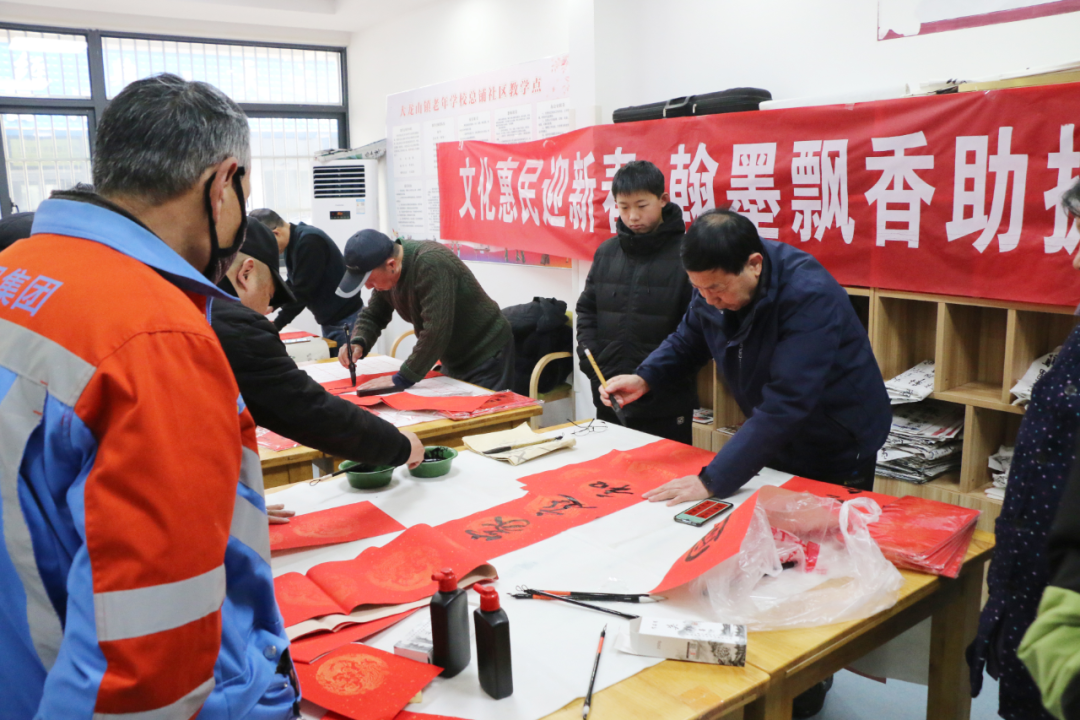 活動現場,人頭攢動。來自大龍山本土的書法愛好者們為群眾寫對聯、送福字,飽蘸濃墨,筆鋒婉轉處,濃墨飄香,一會兒功夫,桌上就擺滿了各式各樣的春聯和“福”字。每一幅春聯,每一個“福”字都寄托著大家對新年美好生活的祝福與期盼。