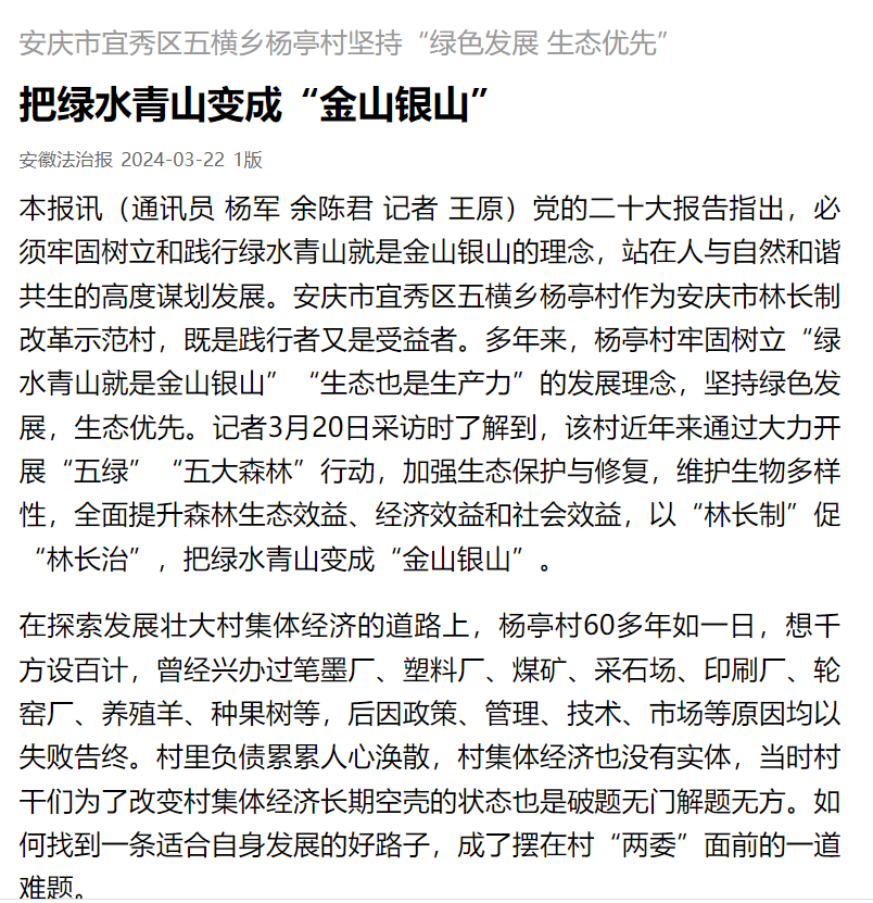 【安徽法制報(bào)】安慶市宜秀區(qū)五橫鄉(xiāng)楊亭村堅(jiān)持“綠色發(fā)展 生態(tài)優(yōu)先” 把綠水青山變成“金山銀山”