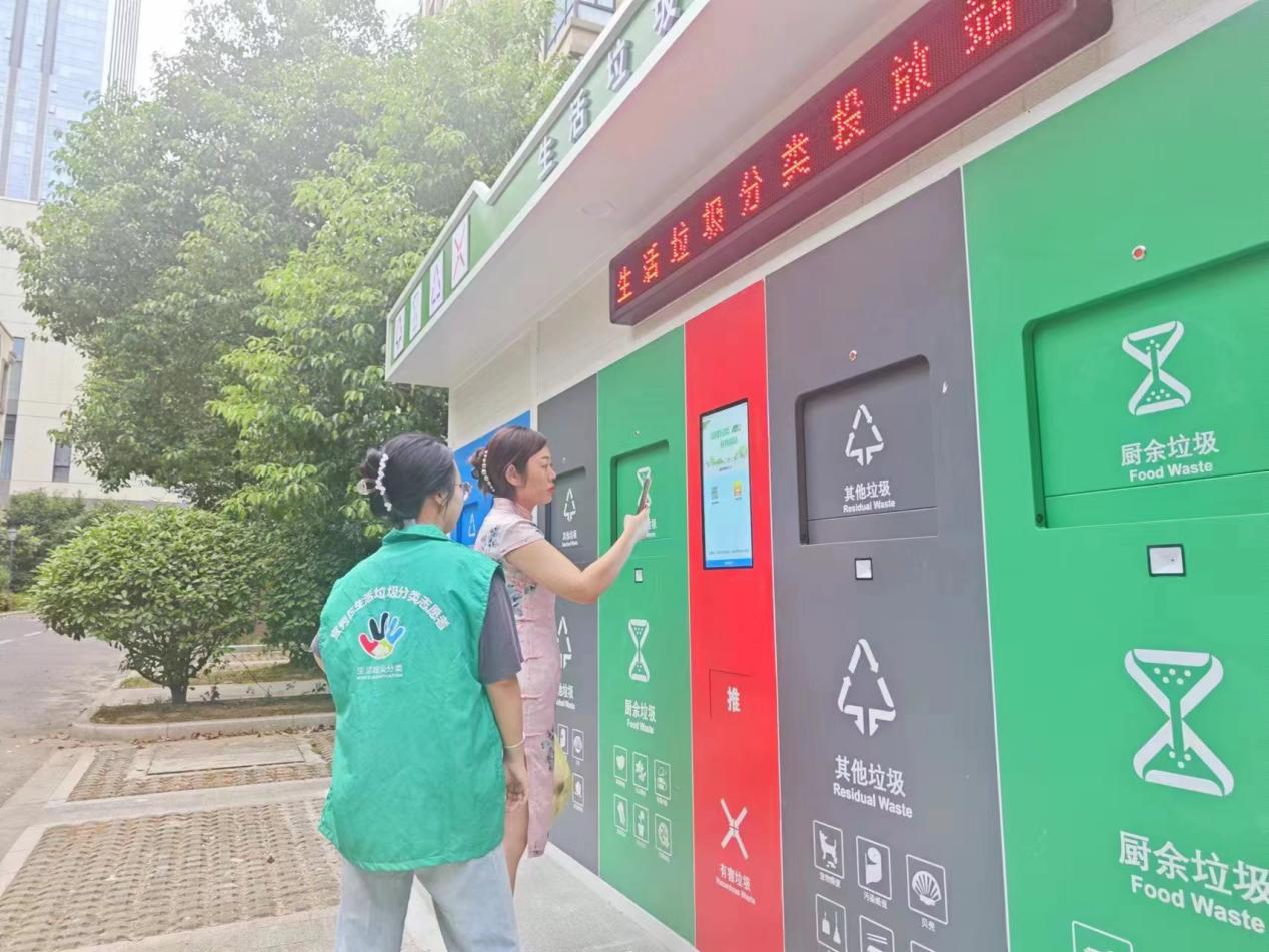 投放高峰時段,志愿者全程“站桶值守”,現(xiàn)場開袋檢查、面對面指導(dǎo)分類,既降低保潔管理成本,又顯著提升分類準確率;同時,徹底解決垃圾全天候露天堆放帶來的異味、污染問題,大幅改善社區(qū)環(huán)境。此外,太平村格外注重投放點的人性化設(shè)計:每個點位均配套便民洗手池(方便居民破袋后清潔)、遮雨棚與照明燈(保障雨天、夜間投放安全),還引入智能噴淋除臭裝置,從源頭消除居民顧慮、化解“鄰避效應(yīng)”,讓垃圾分類充滿管理溫度。